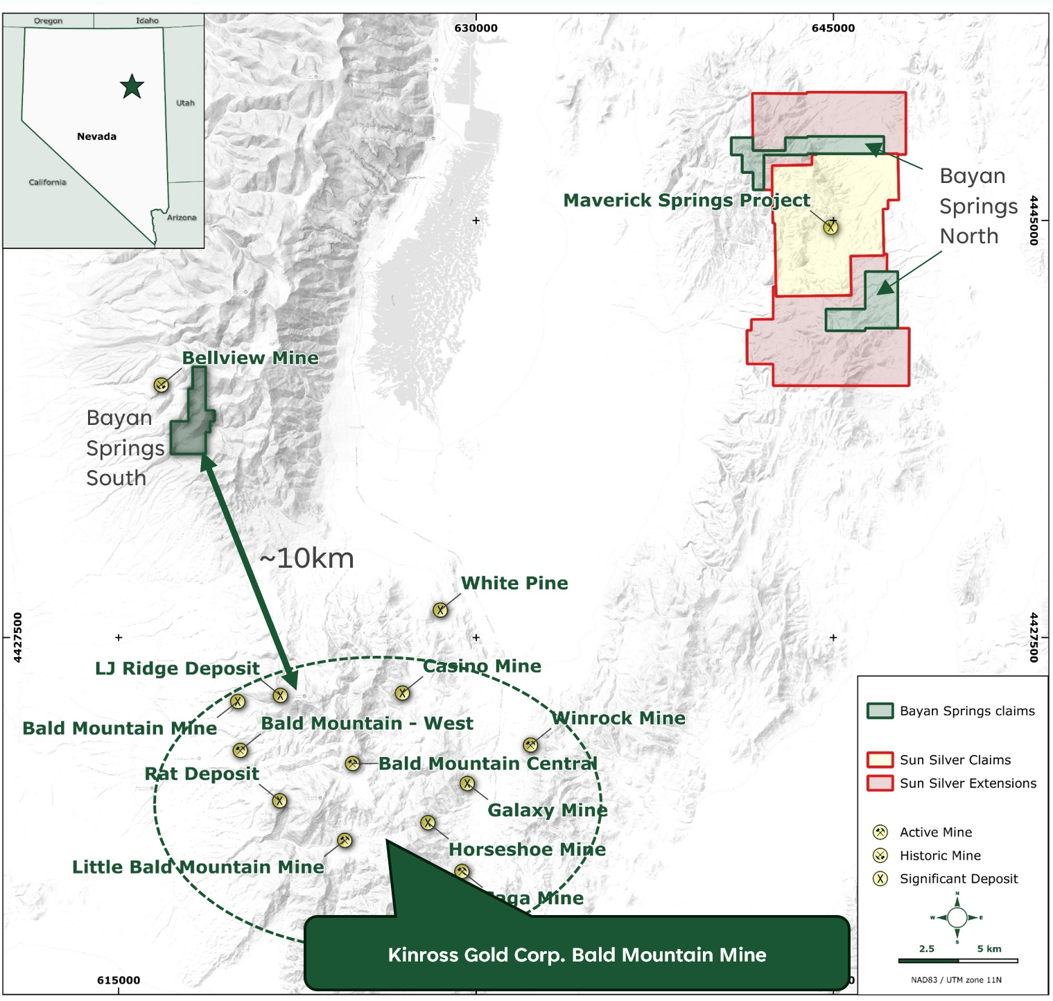 Bayan’s newly staked claims are strategically positioned within a highly prospective region that hosts a number of silver and gold deposits. The claims are immediately along strike from Sun Silver’s (ASX:SS1) Maverick Springs Project and in proximity to Kinross’ (NYSE:KGC) Bald Mountain Mine, located on the renowned Carlin Trend—a prolific mineral belt in Nevada with a history of gold discoveries.