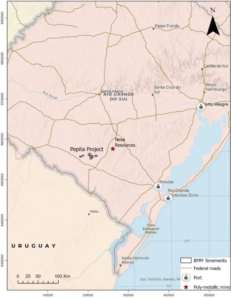 The Pepita Project is located 20 km southwest of Lavras do Sul City, within a goldrich region with excellent infrastructure, including highway access, power supply, and proximity to industrial hubs like Pelotas (150 km) and Porto Alegre (300 km). The area offers a skilled mining workforce, a stable regulatory environment, and year-round exploration conditions, ensuring efficient logistics and cost-effective operations.